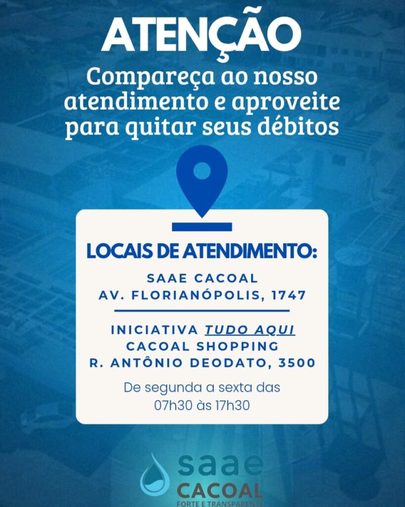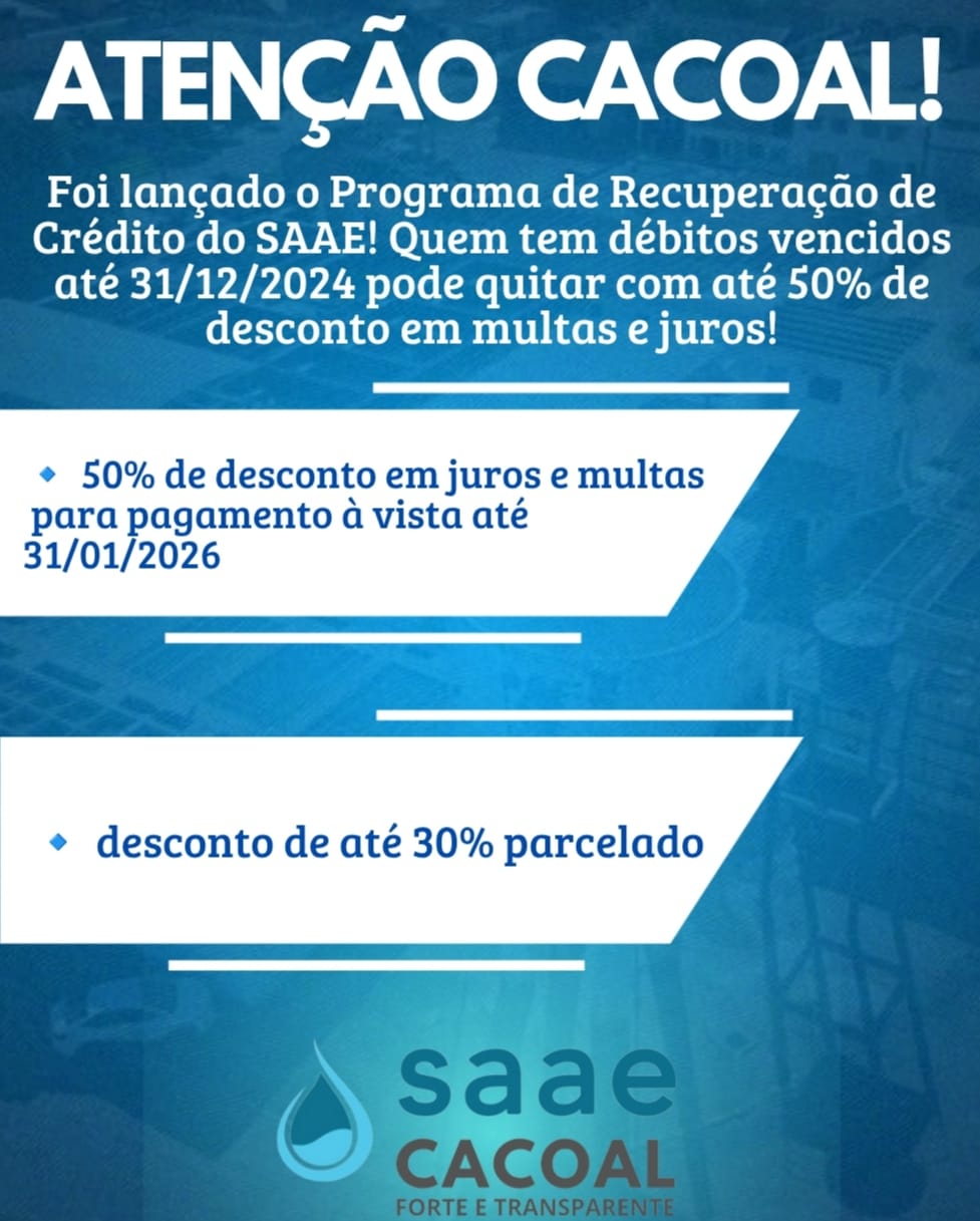 O Serviço Autônomo de Água e Esgoto (SAAE) de Cacoal abriu prazo para adesão ao Programa de Recuperação de Crédito, que prevê condições facilitadas para quitação de débitos vencidos. A iniciativa, regulamentada pela Lei Municipal nº 5.662/PMC/2025, destina-se a consumidores com contas em atraso referentes a serviços de água e esgoto que correu juros e muktas moratorias.